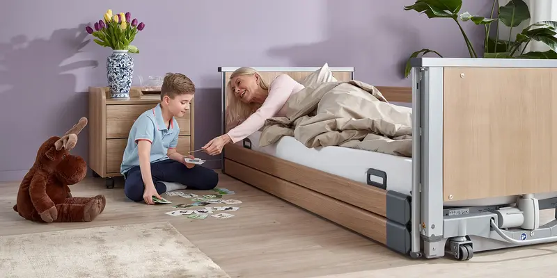 Low-height bed close to floor level – The very low position of 15 cm protects fall-prone users with advanced dementia or a strong tendency to wander from injuries without restricting their mobility.